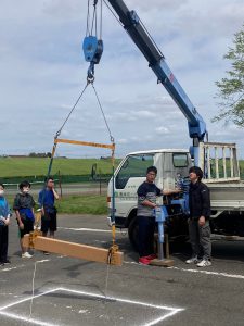 重機操作ブースでは、油圧ショベルやユニック車の操作体験をしました。普段は触れることのない重機の迫力を体感することができました!ユニック車のレバーを操作して重い角材を枠の中に移動させる体験ブースでは、風の強さが災いして思いのほか難しかったようです。