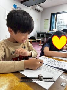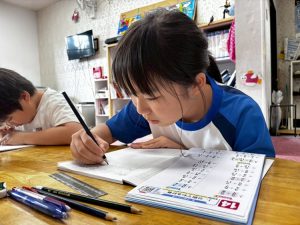 学校の授業で 習った分数の割り算をしとく館で復習している様子です。基礎・要点を職員から聞いて、複雑な計算でもミスが少なく進められています!