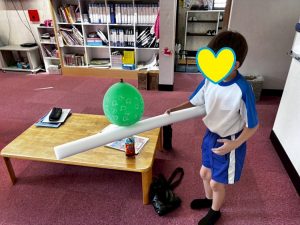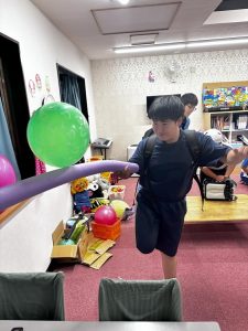 最近の坂東教室では棒を使って風船を落とさないようにバランスを保ち続けるゲームをみんなと遊んでいます。扇風機の風での煽られながらも頑張って耐えていました!