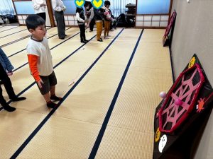 クモの巣をモチーフにした板に向かってボールを投げて何個付くのかを競うゲームをおこないました!「2個付いたよ!」と職員に報告してきたりとハロウィンレクリエーションの中で一番人気のあるゲームになり、楽しんでいる様子でした!