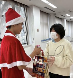 待ちに待ったサンタさんの登場に喜ぶ声と驚きの声と大変盛り上がり、プレゼントを手渡されるときに何が入っているんだろう?と覗き込んでいました(笑)