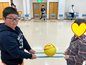 チームを二人ずつに分けて『ボール運び競争』をおこないました!棒を二本用意してボールを乗せ、椅子に向かって走り、座ってから往復するのは難しいようでしたが、職員が走る速度や棒を持つ高さを合わせるようあらかじめ声かけをして上手に運ぶことが出来ていました!職員も体験してみましたがボールを乗せて走るのは難しく落としそうになりました…。やり切ったみんなすごい(*´꒳`*ノノ゙パチパチ