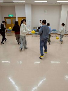 チームを二人ずつに分けて『ボール運び競争』をおこないました!棒を二本用意してボールを乗せ、椅子に向かって走り、座ってから往復するのは難しいようでしたが、職員が走る速度や棒を持つ高さを合わせるようあらかじめ声かけをして上手に運ぶことが出来ていました!職員も体験してみましたがボールを乗せて走るのは難しく落としそうになりました…。やり切ったみんなすごい(*´꒳`*ノノ゙パチパチ